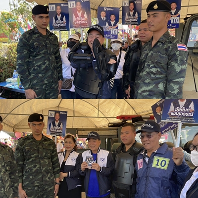 นายชัยยันต์ ผลสุวรรณ์ ผู้สมัครสมาชิกสภาผู้แทนราษฎรจังหวัดปทุมธานี เขต 5 หมายเลข 10 พรรคภูมิใจไทย กล่าวว่า วันนี้มาเยี่ยมแล้วก็มาแนะนำตัวที่เทศบาลตำบลบ้านใหม่ท่านนายกสมบูรณ์ มาเจอเต็นท์ทหารที่มาเอารถรบในส่วนของทหารมาให้เด็กๆได้ชมได้ลองนั่งรถลำเลียงพลที่ผมแวะเข้ามาในเต็นท์ทหารก็เพราะว่าอยากจะมาให้กำลังใจพวกทหารหาญของชาติที่ออกไปรักษาชายแดนให้เราแล้วก็ต้องเข้ามาขอบคุณน้องๆ ครับ ในส่วนนี้ทางพรรคภูมิใจไทยในเรื่องความมั่นคงเราเต็มร้อยอยู่แล้วเรารักษาดินแดนรักษาอธิปไตยให้พี่น้องประชาชน เราจะไม่ยอมเสียศักดิ์ศรีในส่วนของคนไทยให้รั้วของชาติของเรามีความเข้มแข็งแล้วก็มีพลังการรบที่สุดยอดในอาเซียน วันนี้จึงเข้ามาให้กำลังใจน้องๆ