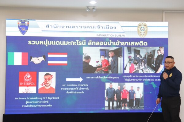 4.สตม.รวบหนุ่มแดนมะกะโรนี ลักลอบนำเข้ายาเสพติดในบ้านเกิด สำนักงานผู้ช่วยทูตฝ่ายตำรวจประจำ สอท.อิตาลี ประจำประเทศไทย ได้ประสานงานร้องขอให้สืบสวนติดตามจับกุม MR.SIMONE (นามสมมติ) อายุ 26 ปี ชาวอิตาลี เนื่องจากถูกออกหมายจับโดยศาลเมือง Asti ประเทศอิตาลี ในความผิดเกี่ยวกับการลักลอบจำหน่ายยาเสพติด โดยตำรวจอิตาลีสืบสวนพบว่ามีการลักลอบส่งยาเสพติด ผ่านพัสดุจากต่างประเทศต่าง ๆ ตั้งแต่เมื่อ ก.ย.2567 – มิ.ย.2568 โดยมียาเสพติดหลายชนิด ทั้งเฮโรอีน, โคเคน, เคตามีน, ยาอี, LSD ซึ่งมีการแอบนำยาเสพติดซุกซ่อนมากับพัสดุจากต่างประเทศ ซึ่งมีการสืบสวนและจับกุมผู้ต้องหาชาวอิตาลีที่รับพัสดุยาเสพติดดังกล่าวแล้ว 2 ราย จากการสืบสวนขยายผล ทำให้ทราบว่ามี MR.SIMONE เป็นผู้จัดส่ง ยาเสพติดดังกล่าวไปให้แก๊งในอิตาลี และนำไปจำหน่ายให้ลูกค้าต่อไป และจากการสืบสวน ทำให้ทราบว่า MR.SIMONE ได้หลบซ่อนตัวอยู่ในประเทศไทย